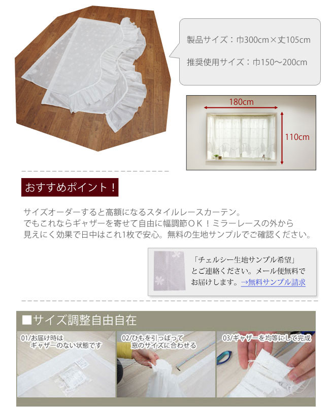 出窓用カーテン レースカーテン ミラーレース Wスカラップ チェルシー 対応サイズ:幅150〜200cm 製品サイズ:幅約300×丈105 115 130cm C-F-1