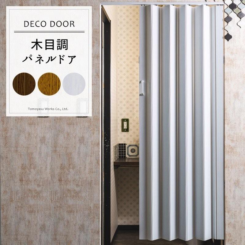 | 「デコドア」は、シックな木目の風合いがお部屋に和みの空間を演出してくれる木目調のパネルドアです。 窓なしタイプなのでプライベートな空間を確保するのに最適。部屋の間の間仕切りパーテーションとして使ったり、物置のような目隠ししたい場所に設置するなど使い勝手はさまざま。 水や汚れに強い樹脂製のパネルを使用しているので、脱衣所などの水回りでの使用もOK! パネルの厚さは6mmとしっかりとしたと厚みがあるので、丈夫で高級感があります。パタパタとすべてのパネルを折り畳んだときのたたみ代は「幅19cm」までコンパクトになるので、使わないときには間口を開放的にしてくれます。 部屋を間仕切ることで冷暖房効率がアップし、節電にもつながります。夏は冷気を逃がさずお部屋を涼しく、冬は暖気を逃がさずお部屋を暖めてくれて、快適な空間に☆ 取っ手がついたドアになっているので、移動するときの開閉もラクチン。エアコンの効きがよくないと感じる場所にもおすすめです。 ★お取扱い注意 ・ドア幅は、製品特性上若干大きめに作られているため、閉めた時にフラット(平な状態)にはなりません。ご了承ください。 ・汚れた場合は石けん水を含んだ雑巾で軽くふいた後、水ふきしてください。本体を水につけて丸洗いはしないでください。また、シンナーやベンジン等の有機溶剤は変質や変色の原因になりますので使用しないでください。 パネルドアの近くで暖房機具等を仕様しないでください。熱で変形したり燃えたりする恐れがあります。 ・定期的にねじなどに緩みがないか点検してください。そのまま使用すると思わぬケガや破損の原因となる恐れがあります。 ・パネルドア本体に物をたてかけたりとがった物が触れないようにしてください。開閉に支障をきたしたり、傷ついたり、思わぬ事故の原因になる恐れがあります。 ・天災などの不可抗力やお客様の取り扱い不注意・不当な修理や改造による故障や破損等は保証いたしません。 ・製品を破棄する場合は、居住地域、各自治体の指示に従ってください。 ・製品は改良の為、仕様を変更する場合がございます。ご了承願います。 ★取り付け時の注意 ・この製品は木ねじを使用して取り付けますので、取付場所が木部(板厚10mm以上)であることをご確認の上とりつけてください。 ・火気、熱を発するもののそばには取付ないでください。また、パネルドアの近くで暖房機具等を使用しないでください。熱で変形したり、燃えたりする恐れがあります。 ・この製品は室内用につくられたものですので、屋外での使用はおやめください。また、直射日光があたる場所でのご使用はおやめください。太陽熱で変形する恐れがあります。 ・石膏ボードへの取付けは落下する恐れがありますのでおやめください。 ・鴨居への取付けは、取付け時に木ねじで鴨居が割れて落下する恐れがありますのでおやめください。 ・取付に際してレール、取手、マグネット受板、木ねじ等の取扱いにはケガをしない様十分にお気を付けください。なお、小さなお子様の手に触れない様ご注意ください。 ・取付場所(木部)が堅い場合は事前に「キリ」等で下穴を開けてから取付けてください。 | 詳細 |