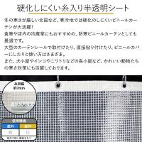 | 工場/倉庫の間仕切り、店舗出入り口、ベランダの雨除け、自宅ガレージに! 耐寒性のポリエチレン(PE)製ビニールシートなので、冬の寒さ厳しい北国や冷蔵倉庫などにおすすめのビニールカーテン! 半透明で糸目が入っていますので、光を通しつつ目隠し効果もある「ビニールカーテン FT08」 |