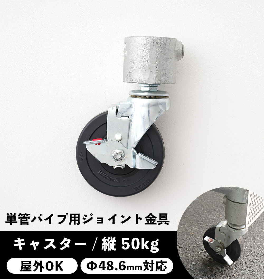 | 単管パイプ用自在型キャスター。 重量物でもロック付きで使いやすいタイプです。 サイズにより耐荷重が異なりますので製作物に合わせてお選びください。 屋外でご使用の場合はローバル等での錆止め加工を行ってください。 ■屋外OK!錆びにくい単管パイプ用ジョイント金具 従来の交差クランプタイプの金具と違い、ぴったりのサイズで組み立てができ、サイズ計算も簡単!重なりの余分がなくスマートで省スペースです。 パイプと金具接続時の引張強度が578kg(※参考値)もあるので、クランプタイプの1000kgには劣りますが、人が乗るものや小屋など重量物の製作には充分な強度。 単管パイプなので、Φ20〜38cmの通常の丸パイプでは強度が足りずできなかった人が乗るものや小屋や屋根、階段など大きなものでも作ることができるのが大きな魅力です。 ■DIY例 屋外の小屋、倉庫、階段、柵、屋根、フェンス、デッキ土台、日よけ枠、タープ台、自転車置き場、ひっかける自転車台、パーゴラ、ガーデニング台、棚、屋外用テーブル・椅子・ベンチ、看板枠、ビニールカーテンやターポリンの枠、ジャングルジム、滑り台などの遊具、雲梯、ハンモック枠、健康器具、風力発電、太陽光発電、バスケットゴール、サッカーゴール、大型犬のドッグハウスなどなど →単管パイプ一覧はこちら →単管パイプ用ジョイント金具一覧はこちら |