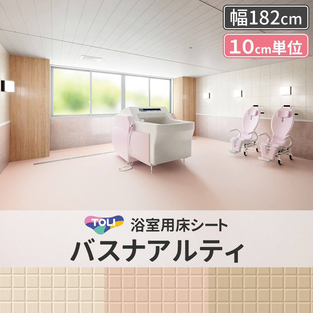 | キャスター走行性や接触温熱感に優れた浴室床シートです。 機械浴室での使用におすすめです。 ■特殊エンボス+バスナハイドロコートでキレイをキープ! ・お手入れらくらく 特殊なエンボスとバスナハイドロコートにより汚れが落ちやすくなりました。長い間キレイな状態を保ちます。・乾燥が早い 特殊なエンボスとバスナハイドロコートにより表面の水滴が薄く拡がることで、床の乾燥を早めます。・傷つきにくい イスのひきずりやシャワーヘッド等の落下を想定した表面強度を持たせているため、床が傷つきにくく長持ちします。■快適で安全!断熱クッションパック層 ・ヒートショック対策 優れた断熱性により、素足で触れてもヒヤッとしにくく、冬場のヒートショックのリスクを軽減します。・滑りにくく、やわらかい エンボス形状と柔らかなクッションの程よい沈み込みで足裏をしっかりグリップし、滑りを防止。転倒時も衝撃を吸収します。・やさしい質感 クッション性のある素材で肌当りが柔らかいため、介護時などの膝つき姿勢がラクになります。[施工可能な下地] モルタルコンクリート・セラミックタイル・FRP樹脂(システムバス) [用途] 住宅の浴室(裸足使用想定)〇 宿泊施設の個室浴室(靴使用想定)〇 施設の浴場(大型の浴場)〇 脱衣室(床暖房)〇 室内プール〇 屋外プール× 天然温泉△(温泉の成分によっては変色等の恐れあり) 浴槽× サウナ× 靴歩行(浴室用途以外)× ※バスナシリーズの施工には床シートのほかに施工用副資材(床材を貼り付ける接着剤や両面テープ、シール材、下地補修材)が必要です。 |