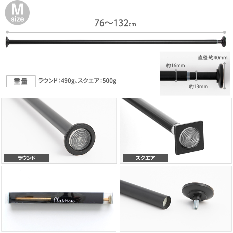 | ■商品名 アイアンテンションロッド『クラシカ』スクエア ■サイズ Mサイズ(76-132cm) 先端部分の直径:約40mm、ロッド(細い側):約13mm、ロッド(太い側):約16mm ■デザイン ラウンド、スクエア ■カラー ブラック、シルバー、ゴールド、アンティークホワイト ■材質 本体:スチール 両端ストッパー:亜鉛合金、PVC ■重量 ラウンド:490g、スクエア:500g ■耐荷重 約3kg ■保証 ![]() |