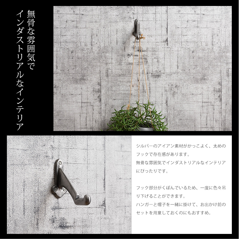 | シルバーのアイアン素材がかっこよく、太めのフックで存在感があります。 無骨な雰囲気でインダストリアルなインテリアにぴったりです。 フック部分がくぼんでいるため、一度に色々吊り下げることができます。 ハンガーと帽子を一緒に掛けて、お出かけ前のセットを用意しておくのにもおすすめ。 |
