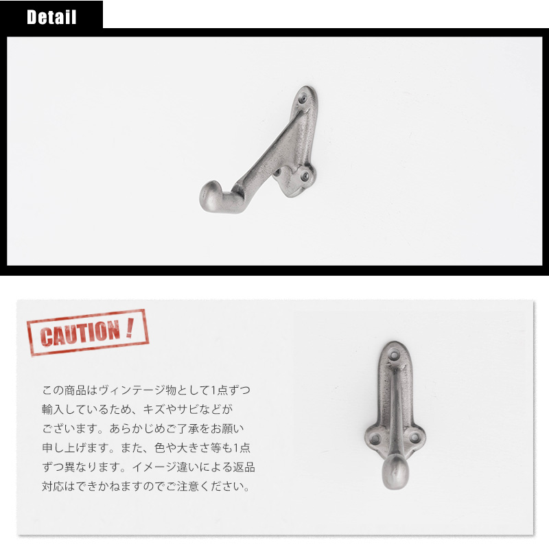 | ・ハンドメイド商品の為、ひとつひとつ色や質感が異なります。 ・キズやサビはアンティークの風合いを出すためのもので、不良品等ではございません。予めご了承お願いいたします。 ・下地があることをご確認の上、お取り付けください。 ・許容荷重を超えたものを掛けることは絶対におやめください。思わぬケガの原因や物の破損につながる危険があります。 |