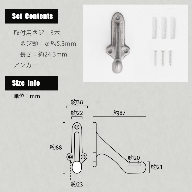 | ■商品名 アイアンフック SVA-3 ■サイズ 約W38×D87×H88mm ■重量 約167g ■材質 鉄 ■付属品 ・取付用ネジ(ネジ頭:φ約5.3mm 長さ:約24.3mm)3本 ・アンカー ■耐荷重 約5kg ■生産国 インド |