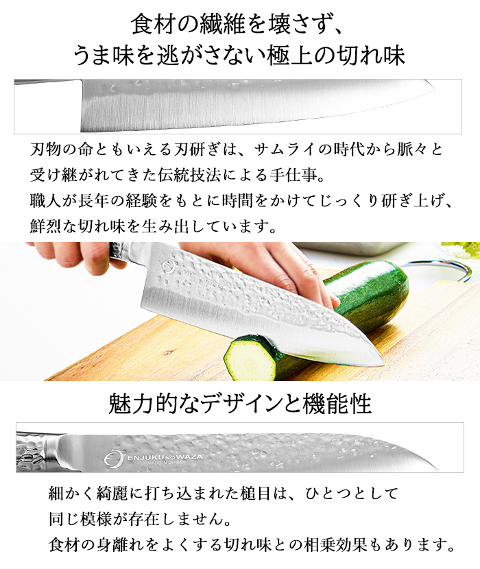 槌目があることで食材の身離れが良く、切れ味との相乗効果も。