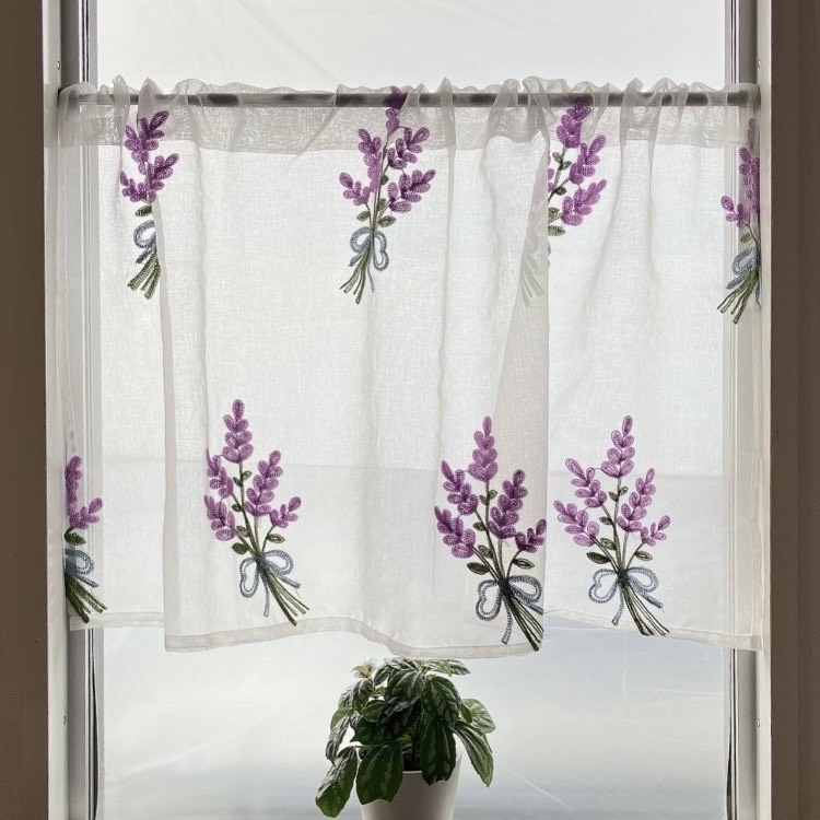 カフェカーテン 紫 ラベンダー 幅100cm×丈55cm 刺繍 小窓 突っ張り棒 出窓 仕切り