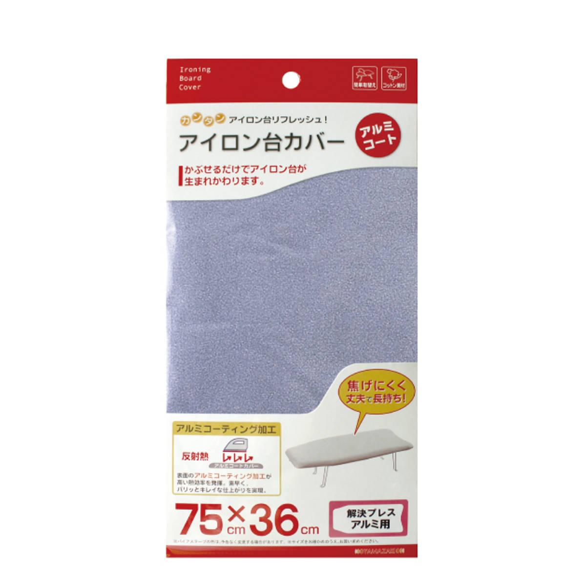 簡単に取替えできるアイロン台カバー 解決プレスアルミ用被せるだけでアイロン台が生まれ変わる、アイロン台カバーです。表面のアルミコーティング加工が高い熱効果を発揮し、素早くパリッとキレイな仕上がりを実現します。焦げにくく、丈夫で長持ちしやすいです。