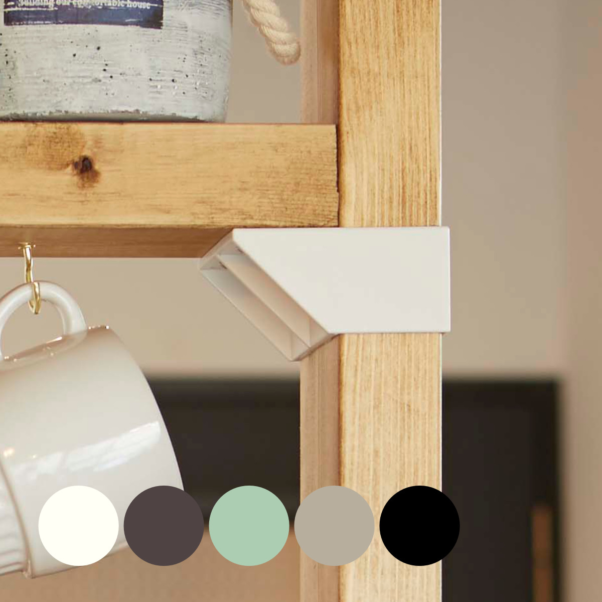 棚を取り付けるための棚受けパーツ 「2×4棚受 シングル」別売りの「LABROCO(ラブリコ)アジャスター」を使って設置した2×4支柱に、棚を取り付けるための棚受けパーツです。支柱制作時に木材にはめこみ、棚板の高さを決めるだけで、ネジ位置の計測や下穴加工が不要で固定できます。