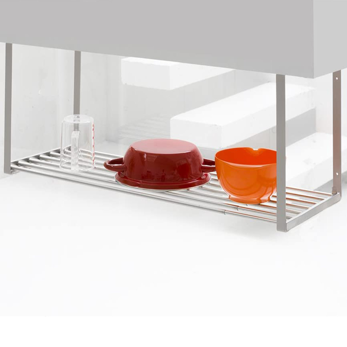 | 材質 | 棚(パイプ)、木ネジ:ステンレス 棚(樹脂部):ナイロン 枠:スチールに焼付塗装 |
