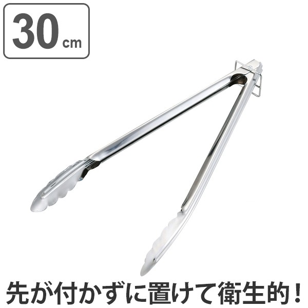 収納ストッパーで固定すると、トングの先端が卓上に付かず置くことができる衛生的で便利なトングです。さびや汚れに強いステンレス製です。【商品詳細】 サイズ/全長:約30cm 内容量/1個 材質/ステンレス鋼 生産国/中国製《長め 調理用品 キャンプ用品 アウトドア用品》
