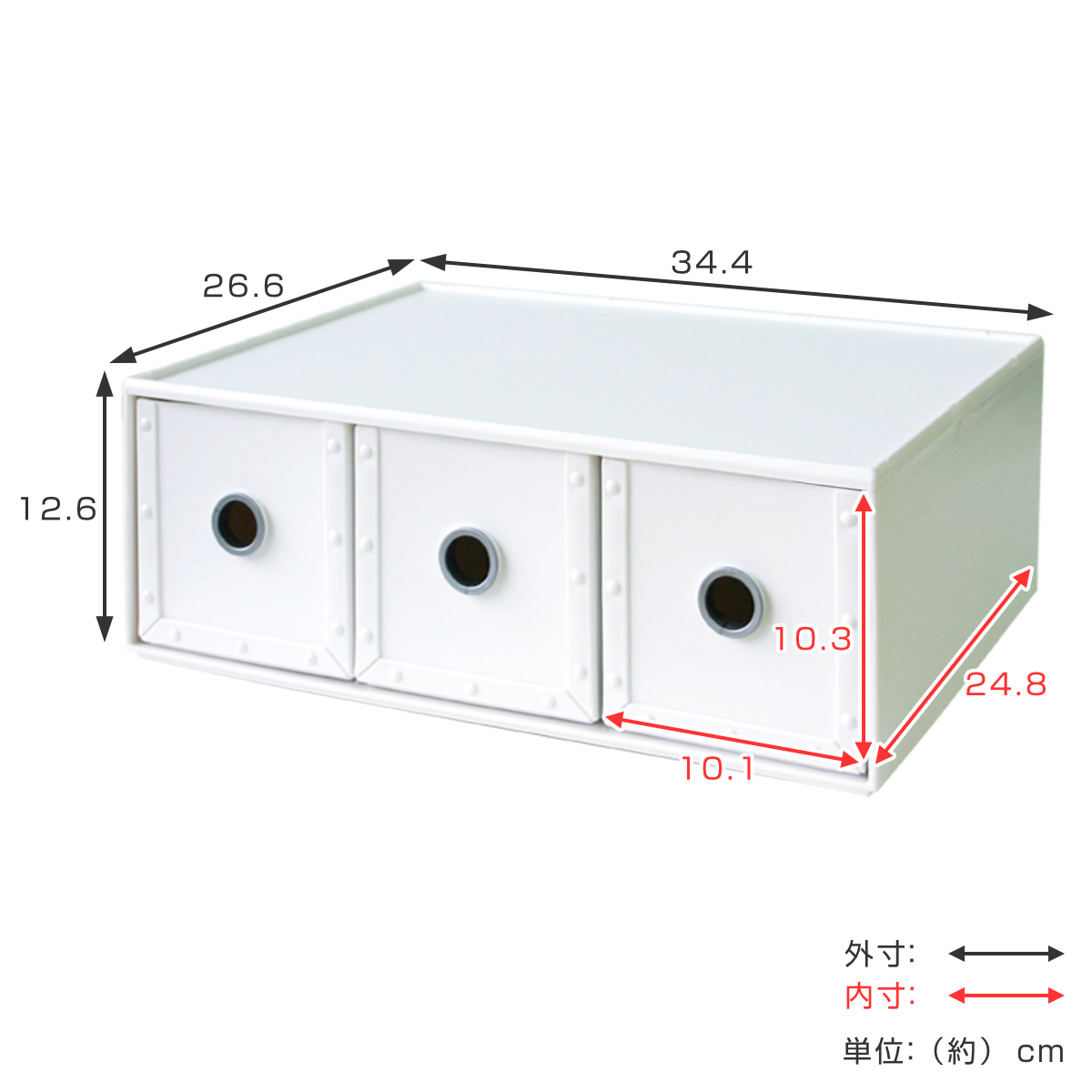| サイズ | 約 幅34.4×奥行26.6×高さ12.6(cm) 一つあたりの引出し内寸:約 幅10.1×奥行24.8×高さ10.3(cm) |