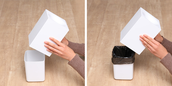 中の容器にカバーが出来る仕組みになっています。容器にかぶせた袋を隠すことが出来るので、生活感が出やすいゴミ箱もスマートにお使いいただけます。また、丸洗いも可能なのでお手入れも簡単です。