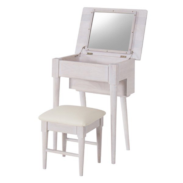 優しい雰囲気の木製ドレッサーとスツールのセット収納部分は使うときだけ開閉できる、オープンタイプの木製ドレッサーです。