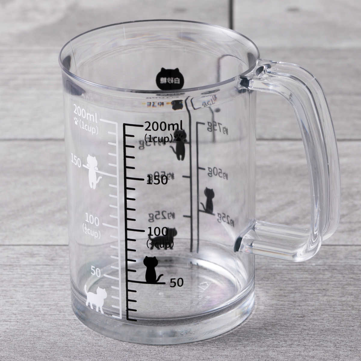 量る調味料や液体の色によって見やすいネコが変わる200mlの計量カップです。白の目盛りは色の濃いもの、黒の目盛りは色の薄いものと、分量がパっと見ただけではっきり分かります。
