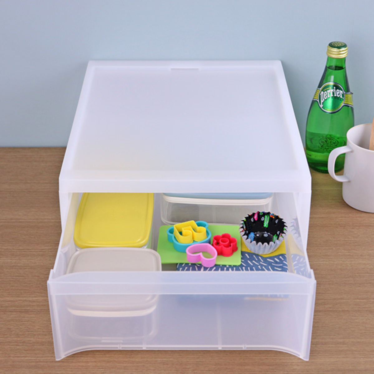 中身が見える引き出し・中身が透けにくい外枠引出しはクリアに近い半透明で、開けなくても中身が分かりやすくなっています。外枠部分は白味の強いやわらかな半透明なので、中身が透けすぎずお部屋の雰囲気を壊しません。