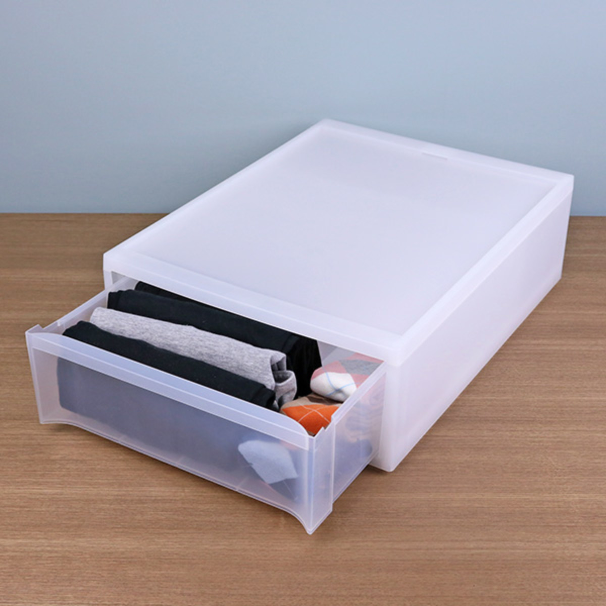 引出しはクリアに近い半透明で、開けなくても中身が分かりやすくなっています。外枠部分は白味の強いやわらかな半透明なので、中身が透けすぎずお部屋の雰囲気を壊しません。