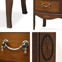 | タッセル模様 引き出しの取っ手には、ヨーロッパ調のタッセル模様が採用され、クラシカルさを強調しています。 | 熟練の職人技術である象嵌細工 材木の表面を彫り込み、色の異なる飾り木を埋め込んで1つの模様を表現する高度な技術が施されています。 |