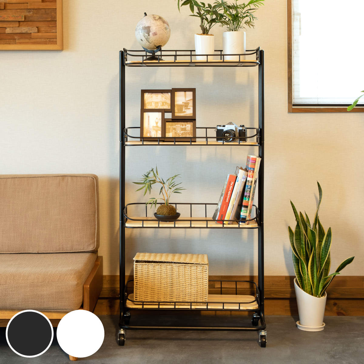 A4サイズの書類等の出し入れがしやすいように、カゴの前面のフレームは低く設定しています。実用性とインテリア性を兼ね備えた棚が魅力なラックです。