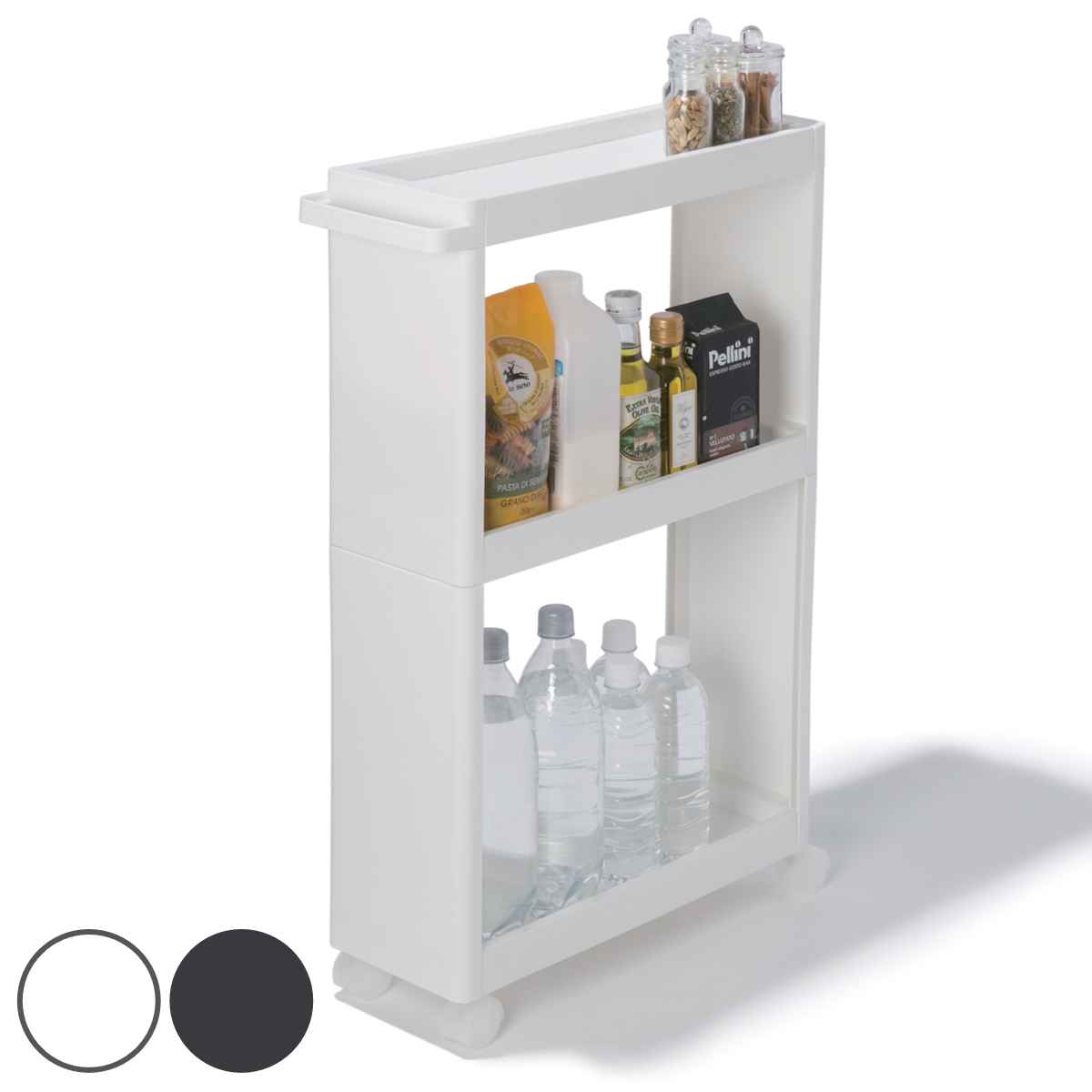 幅17cmのすき間を収納スペースにキッチンやランドリーのちょっとした隙間を有効活用できるスリムワゴンです。キッチンでは食料品や調味料、水など、ランドリーでは雑貨類、洗剤などのストックがすっきり収納できます。