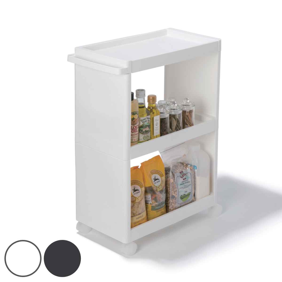 幅26cmのすき間を収納スペースにキッチンやランドリーのちょっとした隙間を有効活用できるスリムワゴンです。キッチンでは食料品や調味料、水など、ランドリーでは雑貨類、洗剤などのストックがすっきり収納できます。