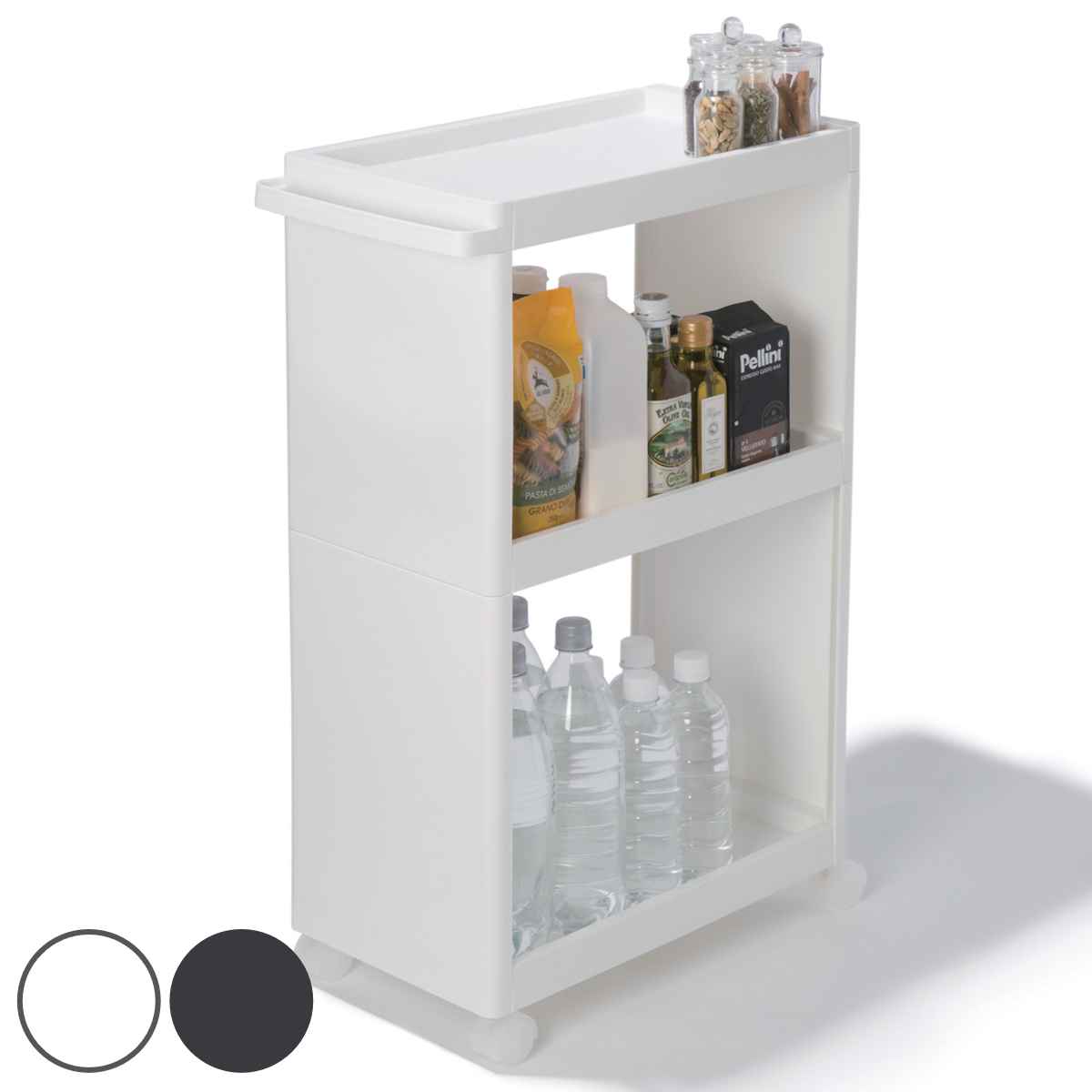 幅26cmのすき間を収納スペースにキッチンやランドリーのちょっとした隙間を有効活用できるスリムワゴンです。キッチンでは食料品や調味料、水など、ランドリーでは雑貨類、洗剤などのストックがすっきり収納できます。