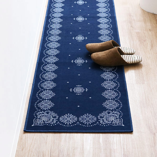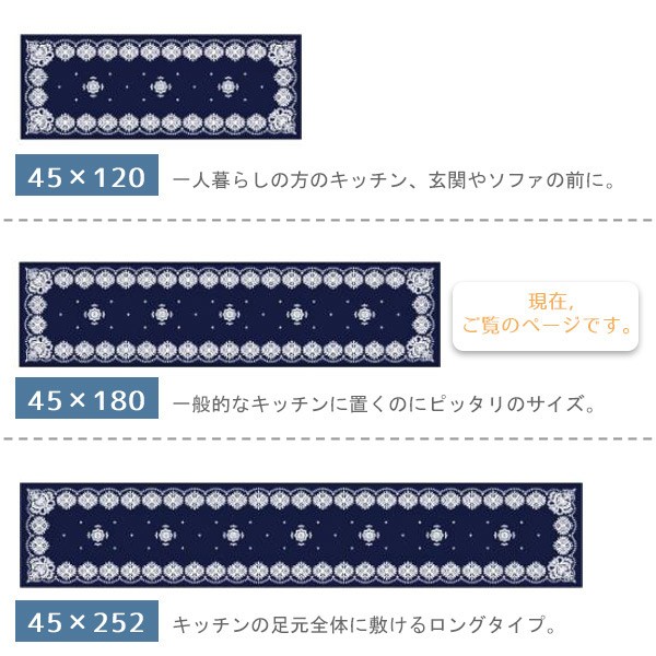 おしゃれなバンダナ柄のキッチンマットアメリカンヴィンテージなムード漂うバンダナ柄がおしゃれなインテリアマットです。殺風景なキッチン周りやお部屋の印象をガラリと変え、足元から雰囲気のある空間に。120cm、180cm、240cmのサイズ展開でシーンに合わせて様々な場所でお使いいただけます。※このページの商品は45×180cmです。