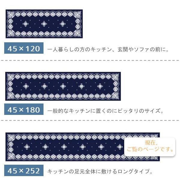 おしゃれなバンダナ柄のキッチンマットアメリカンヴィンテージなムード漂うバンダナ柄がおしゃれなインテリアマットです。殺風景なキッチン周りやお部屋の印象をガラリと変え、足元から雰囲気のある空間に。120cm、180cm、240cmのサイズ展開でシーンに合わせて様々な場所でお使いいただけます。※このページの商品は45×240cmです。