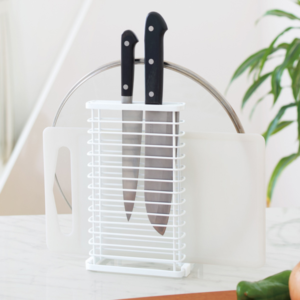 キッチン周りをすっきりシンプルに!まとめて一括収納●まな板2枚、包丁3本、鍋フタ1個を、まとめて収納できる、スチール製のスタンドです。