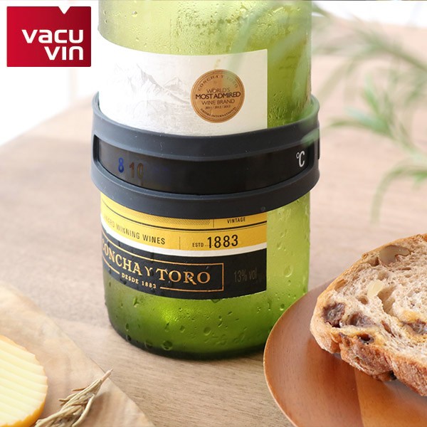 ユニークなデザインワインにくるりと巻きついて簡単にセットすることが出来ます。一般的なワインボトルに幅広く対応し、500ml用ペットボトルの温度も測ることが出来ます。 | ワインごとの最適温度が分かる本体裏側にはワインの種類と最適温度が表示されています。飲み頃の温度でワインを飲めば美味しさも格別です。 |