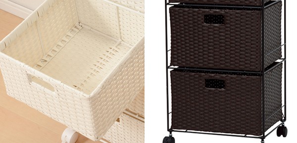 水に強い樹脂素材を編み込んだラタン調のデザインで、通気性に優れています。サッと拭き上げるだけで簡単にお手入れができるので、水回りでも活躍します。天然素材特有の節やささくれがなく、大切なお洋服やタオルを引っ掛けて傷付けにくいので安心です。