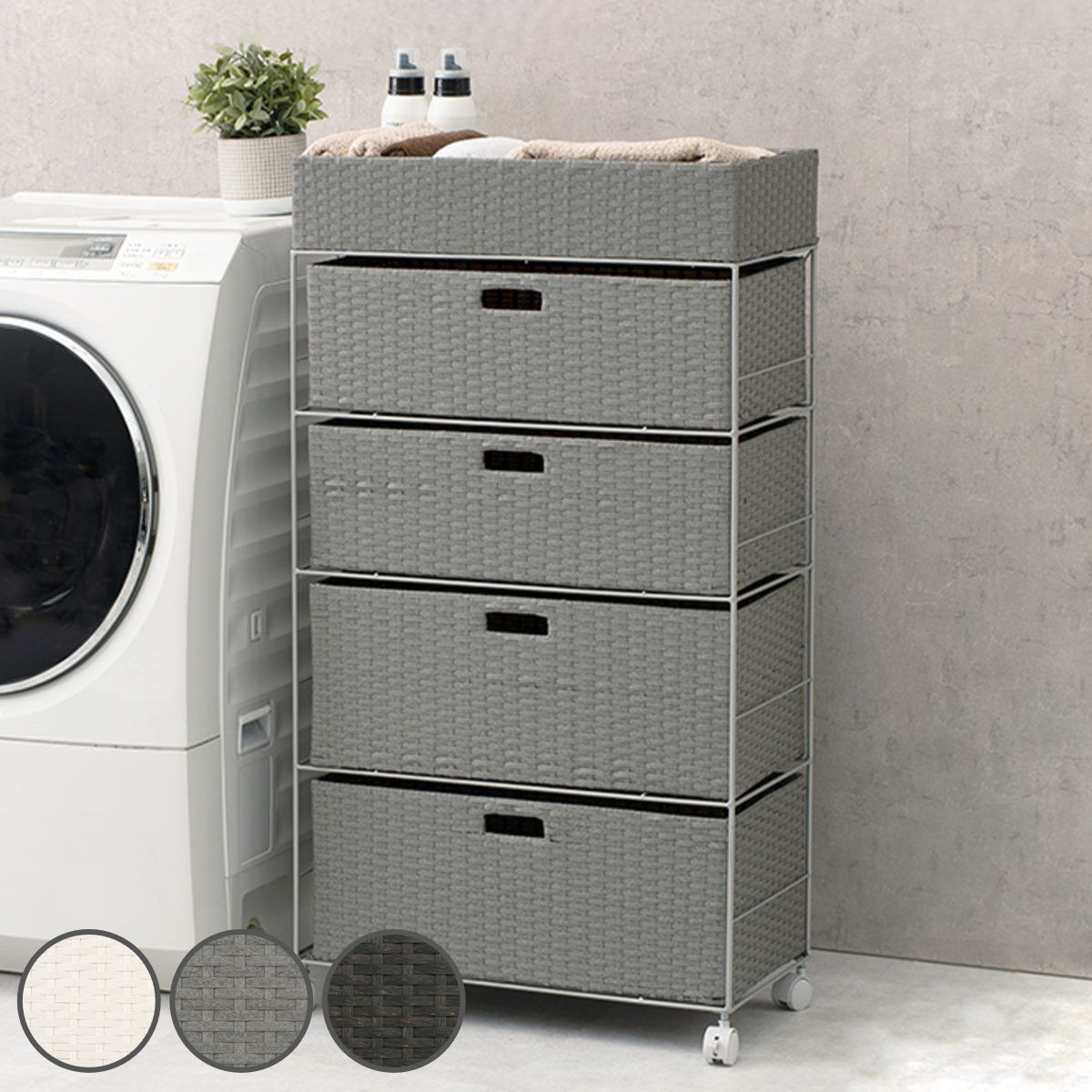 ランドリーチェスト 幅60.5cm 4段 引出し キャスター付 完成品 ( ラタン調 ランドリー チェスト ラック 防水 撥水 収納 かご )