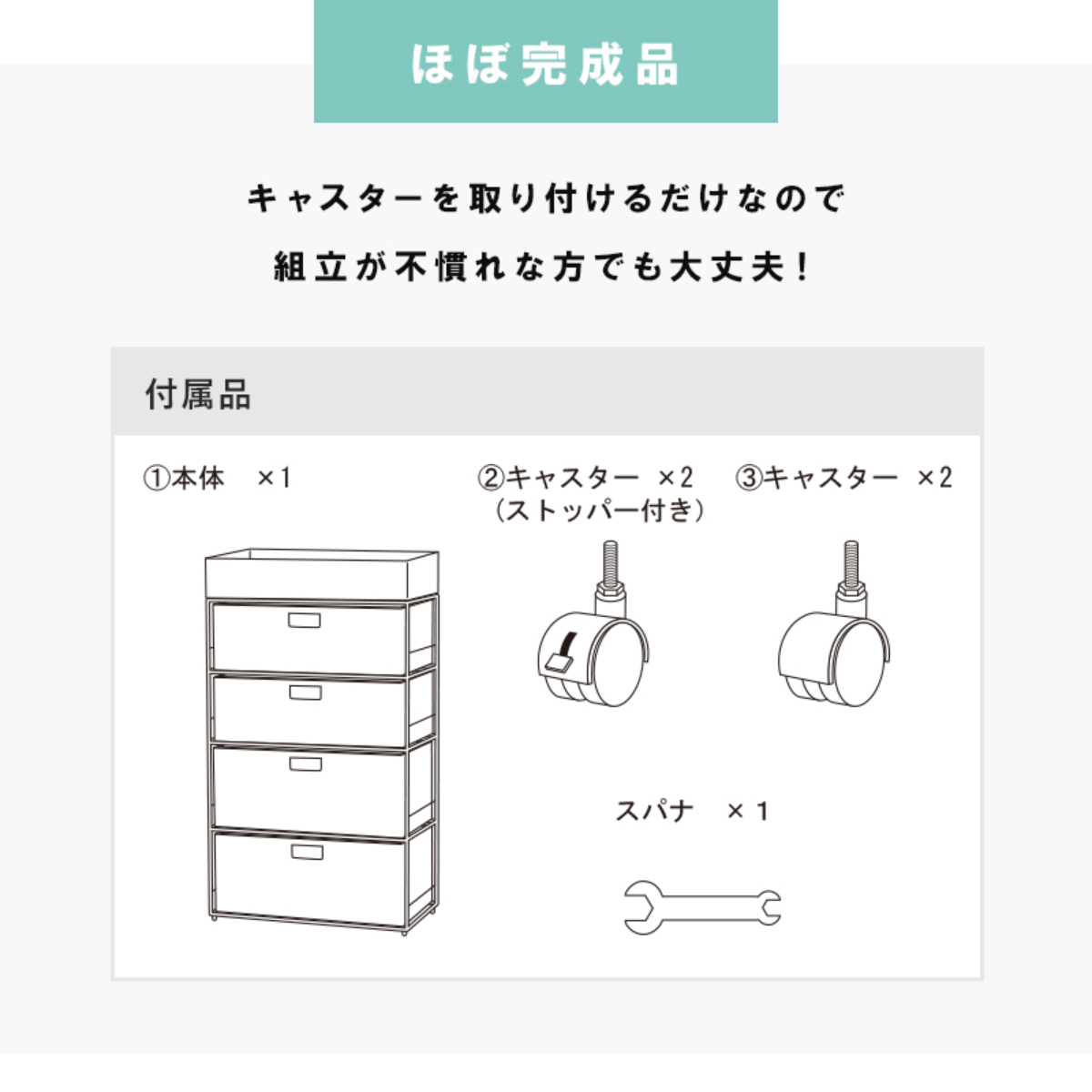 ●付属の工具でキャスターを取り付けるだけですぐに使える完成品です。