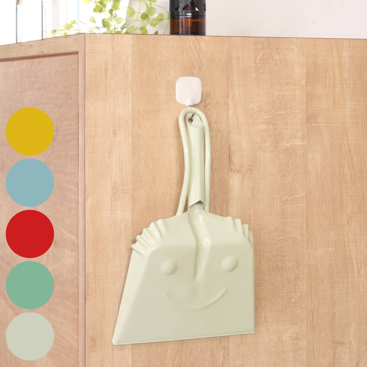 ちりとりに吊り下げて収納できる穴が開いてます。ほうきもちりとりの柄に掛けてまとめることが可能です。下駄箱や棚など毎日使いたい場所に吊るしておけるので、思い立った時にサッとお掃除ができます。