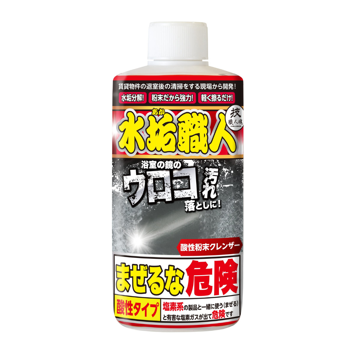 水まわりのお困りの汚れを解決水垢職人は、酸性の粉末と研磨剤を両方粉体で配合することにより水に濡れると酸性液体になり研磨剤も溶けずに使える強力な洗浄剤です。