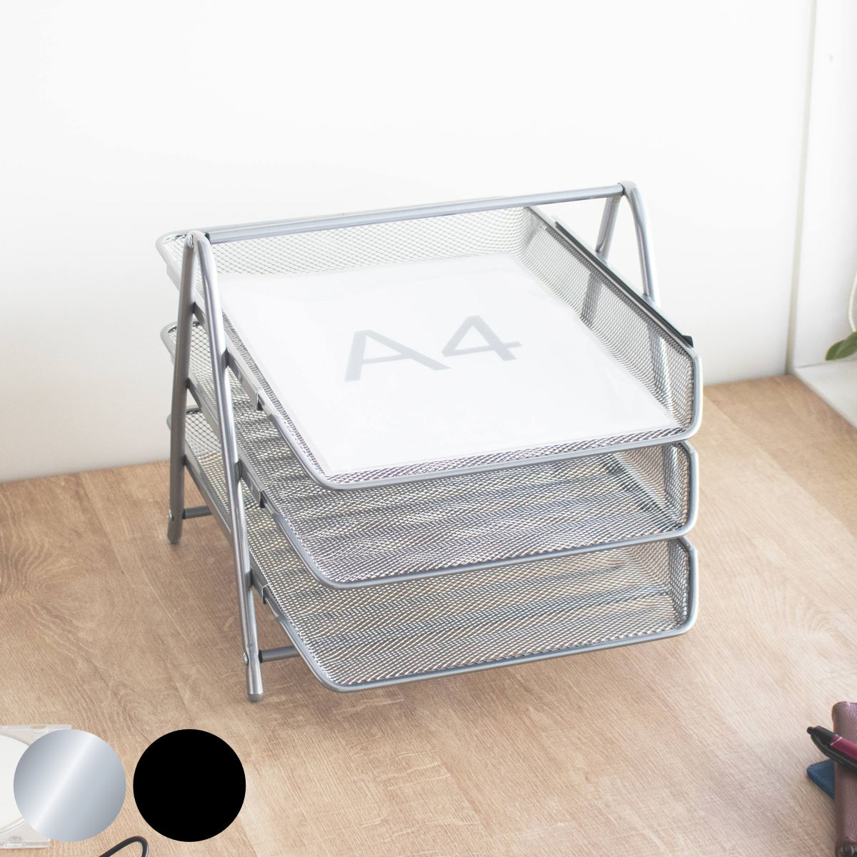 トレーはA4サイズのクリアファイルが収まるサイズ設計。縦に3段のトレーが付いているため、書類を種類ごとに分けて整理でき、デスク周りをすっきり整頓できます。