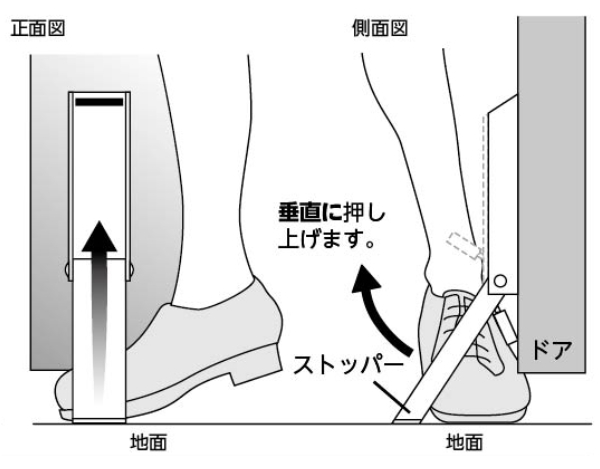 ドアを固定する場合は、ドアを固定したい位置に手で押さえながら、ストッパーのプレート部分を足で垂直に押し下げます。