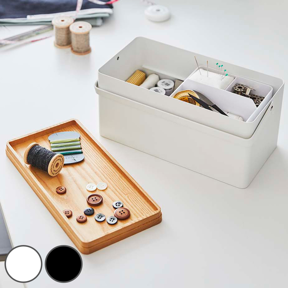 | 材質 | 容器:スチール(粉体塗装) 蓋:天然木(ラッカー塗装) トレー:ABS樹脂 針山:綿100% クッション材:ポリエステル |