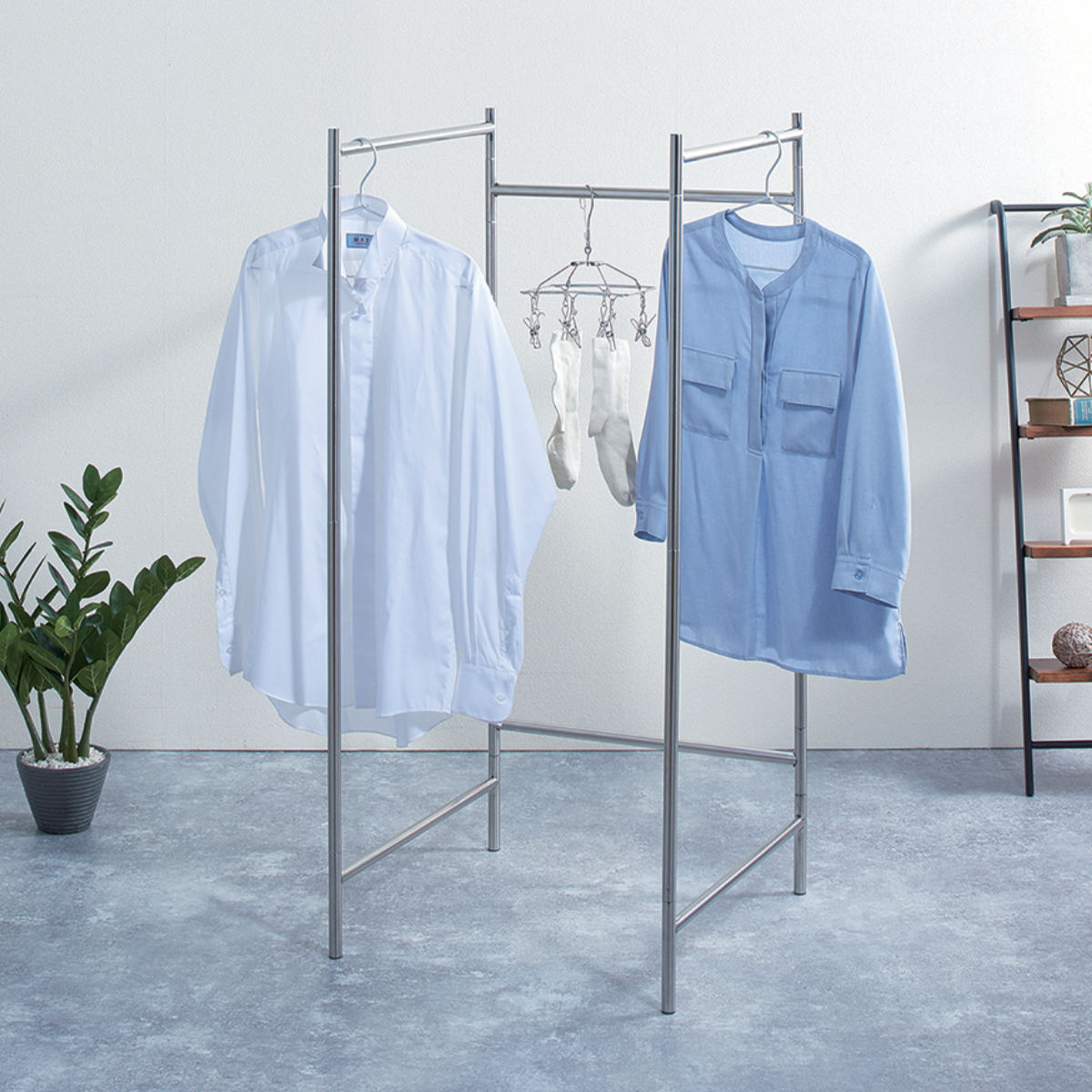 自在に変形できるお部屋のスペースなどに合わせて変形でき、コートハンガーのように使用することもできます。 | コンパクトに収納使わないときは折りたたんでクローゼットやちょっとしたスペースに収納できます。 |