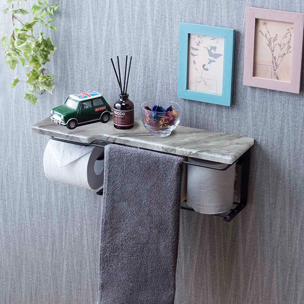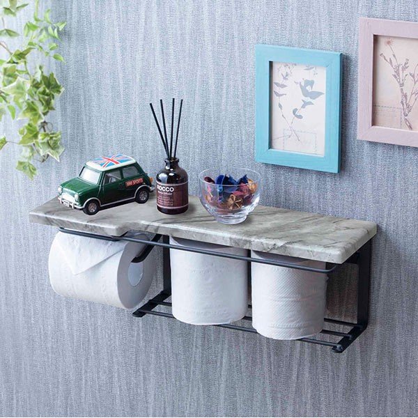 大理石調のお洒落なトイレットペーパーホルダーです。ペーパーロールをストックしておくことが出来る棚付きです。シックな雰囲気でトイレ空間をお洒落に演出します。