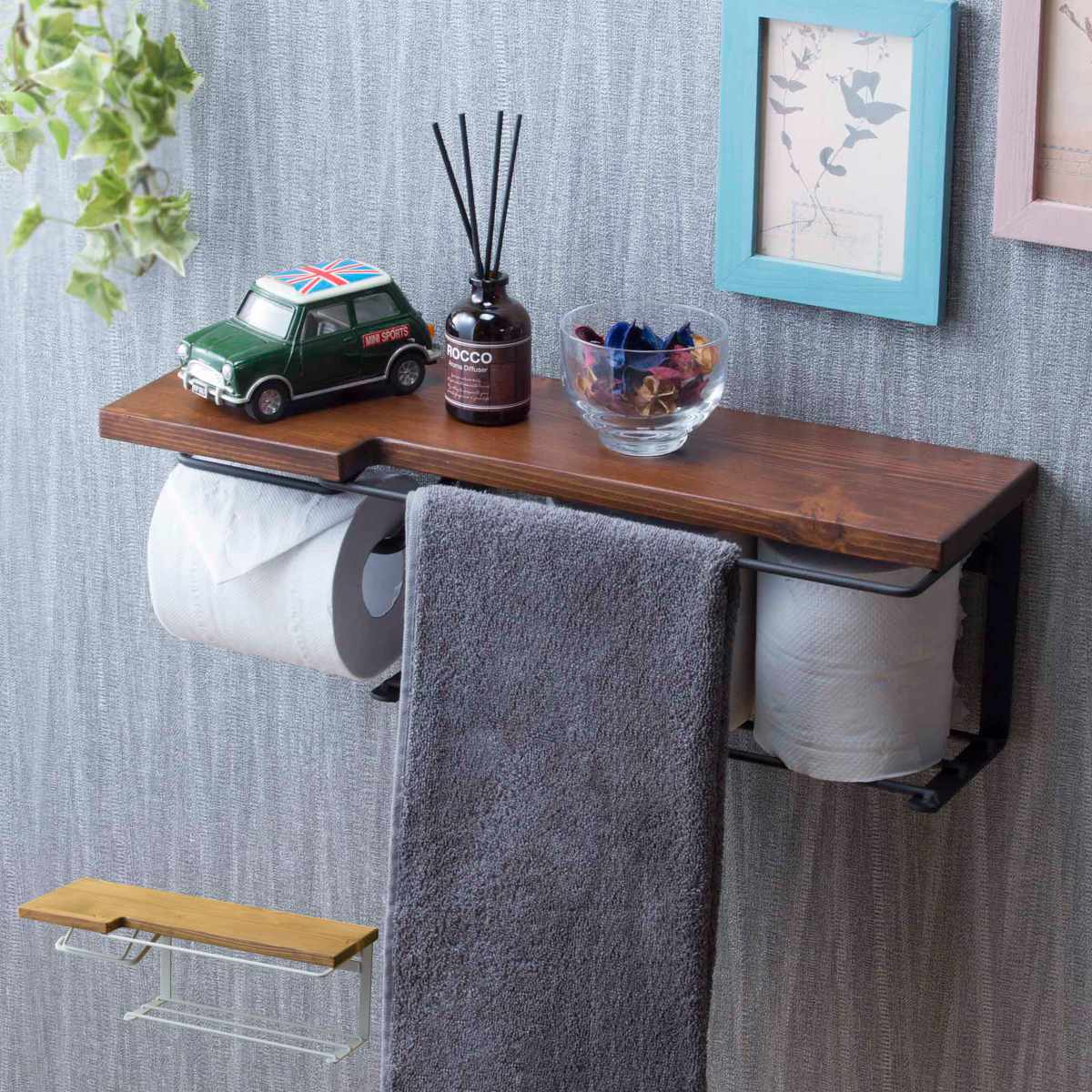 ●天然木とスチールを組み合わせた、ヴィンテージ風のお洒落なトイレットペーパーホルダーです。