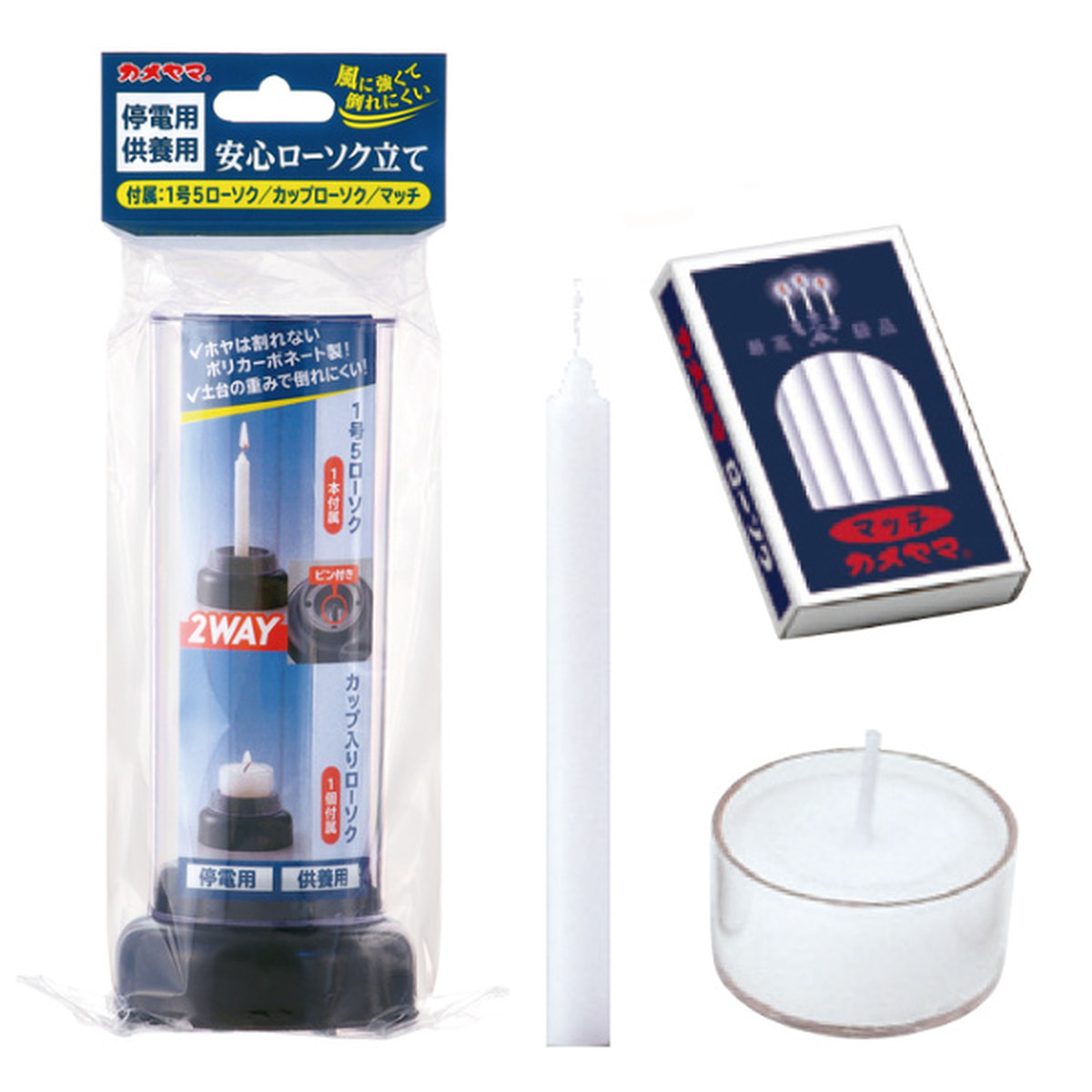 1号5ローソクとカップローソク、さらにマッチ付きなので、届いたらすぐにお使いいただけます。