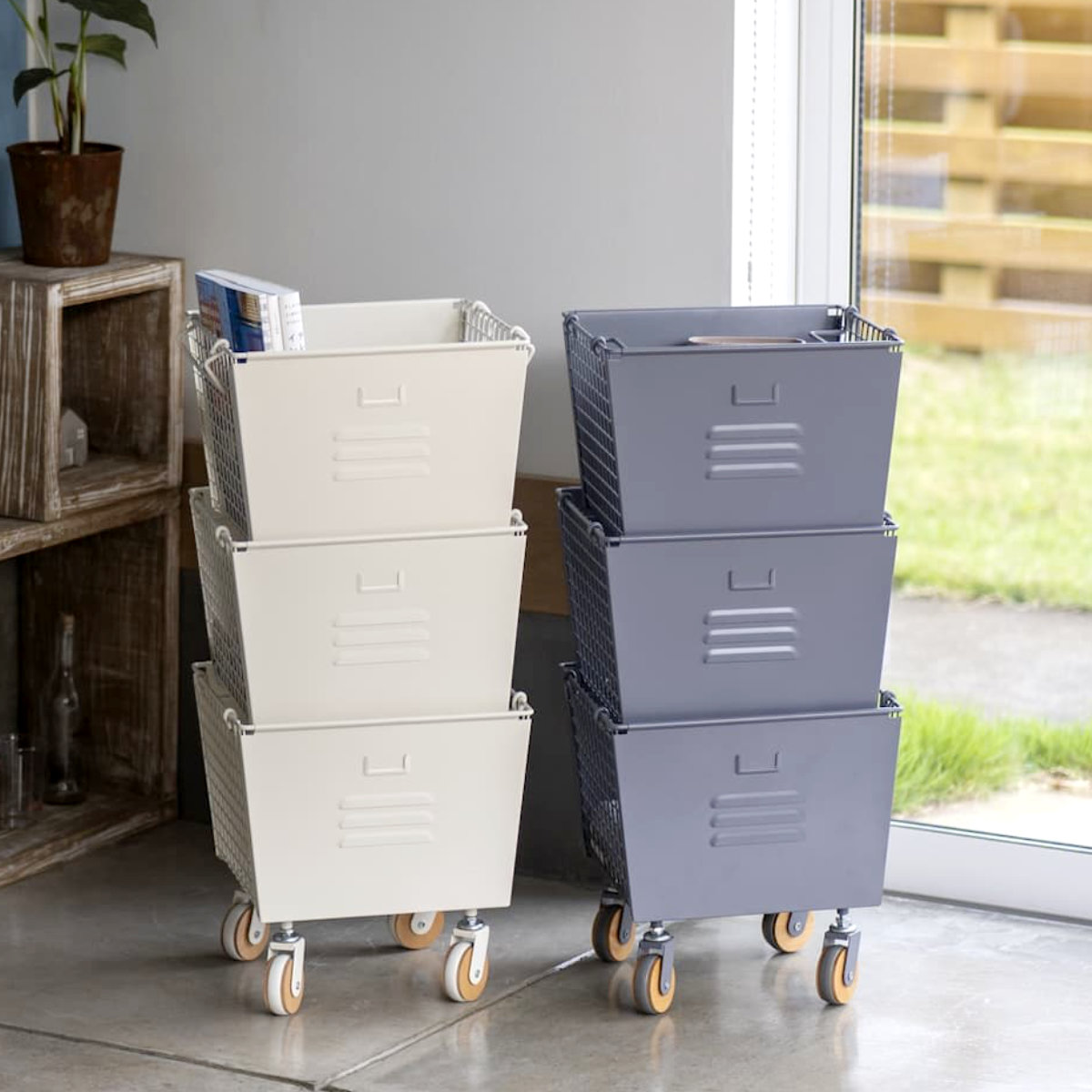 ●インダストリアルなデザインで、3個セットのボックスは重ねて省スペースに収納できます。