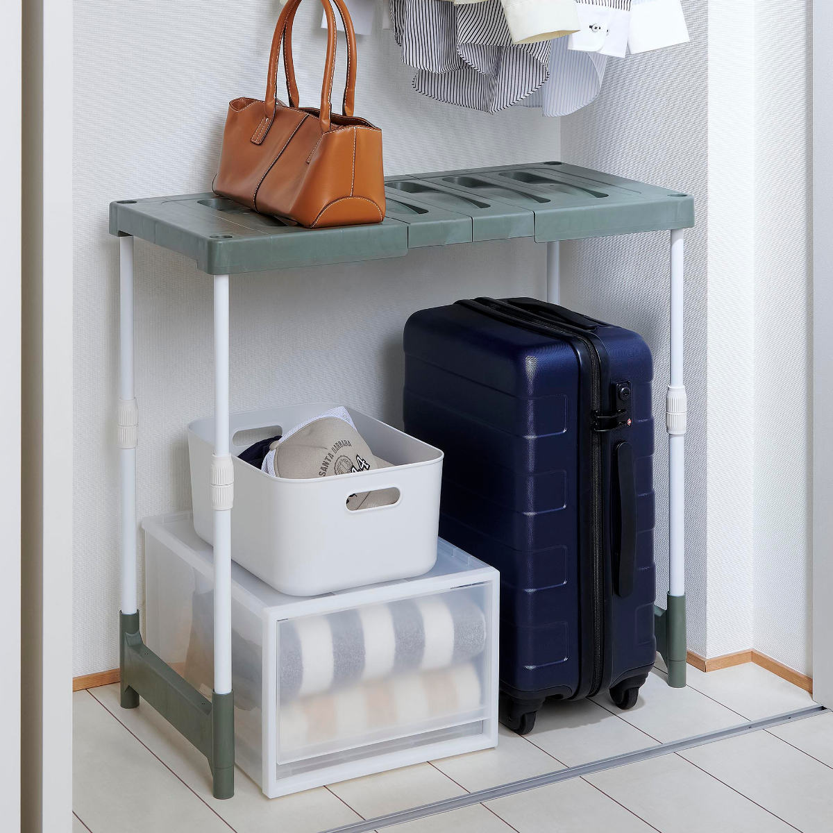 クローゼットや押入れの余っているタテの空間を、上下に分割して無駄なく有効活用できるフリーラックです。幅は伸縮可能で、収納する場所やデッドスペースに合わせてお使いいただけます。
