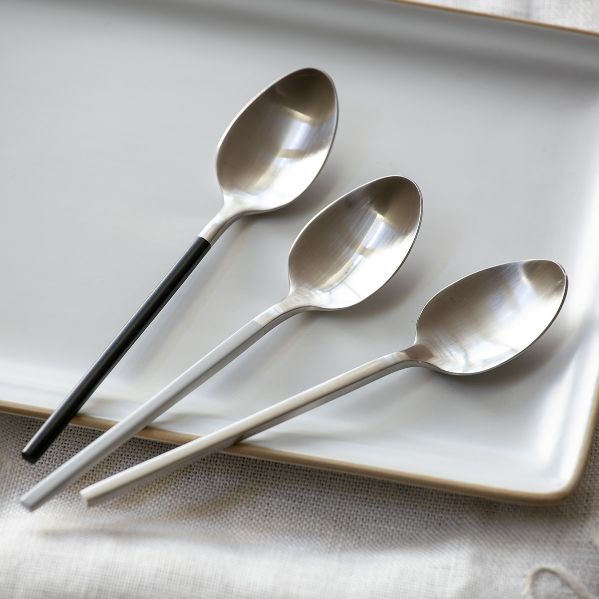 スリムでスクエア型の持ち手柄の部分はすらりと細く、持ちやすいスクエア型です。シルバーはツヤのないマットな質感、ホワイトとブラックはツヤを抑えたセミマットな質感です。ステンレスの表面には「ヘアライン」と呼ばれるステンレスならではの筋があり、高級感のある落ち着いた雰囲気に仕上がっています。