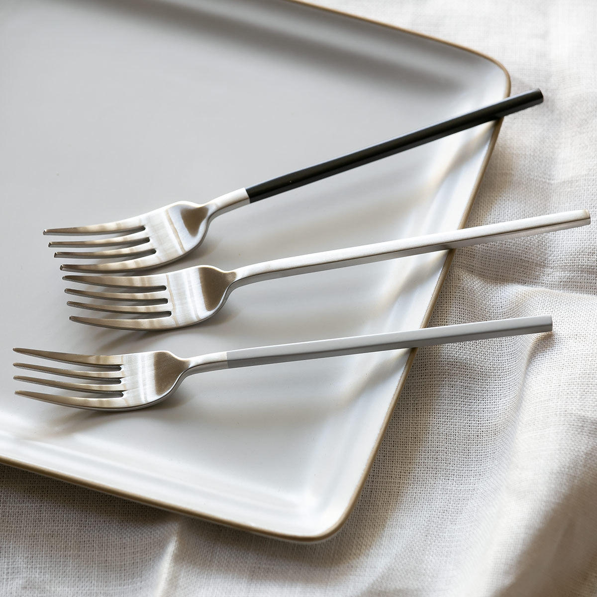 スリムでスクエア型の持ち手柄の部分はすらりと細く、持ちやすいスクエア型です。シルバーはツヤのないマットな質感、ホワイトとブラックはツヤを抑えたセミマットな質感です。ステンレスの表面には「ヘアライン」と呼ばれるステンレスならではの筋があり、高級感のある落ち着いた雰囲気に仕上がっています。