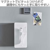 裏面にマグネットが付いていて、冷蔵庫やステンレス壁面などのマグネットの付く平らな場所にボックスティッシュを簡単に取り付けできます。縦向きにも横向きにも取り付け可能です。