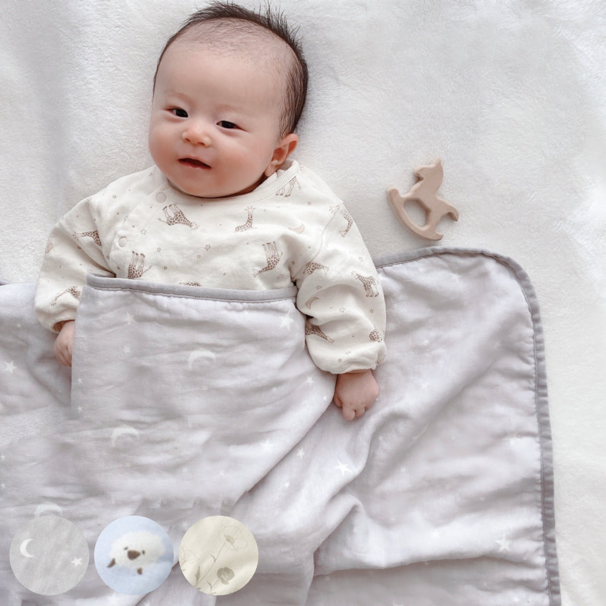 綿100%で優しく包み込む表面は柔らかな綿100%のガーゼ、裏面は吸水性の良いふんわりパイルで仕上げました。お昼寝中や冷房の風が強い時、外出時の防寒や日除け対策に、お子さまの体温を快適に保ち、優しく包み込みます。