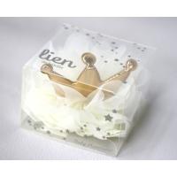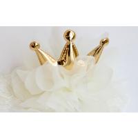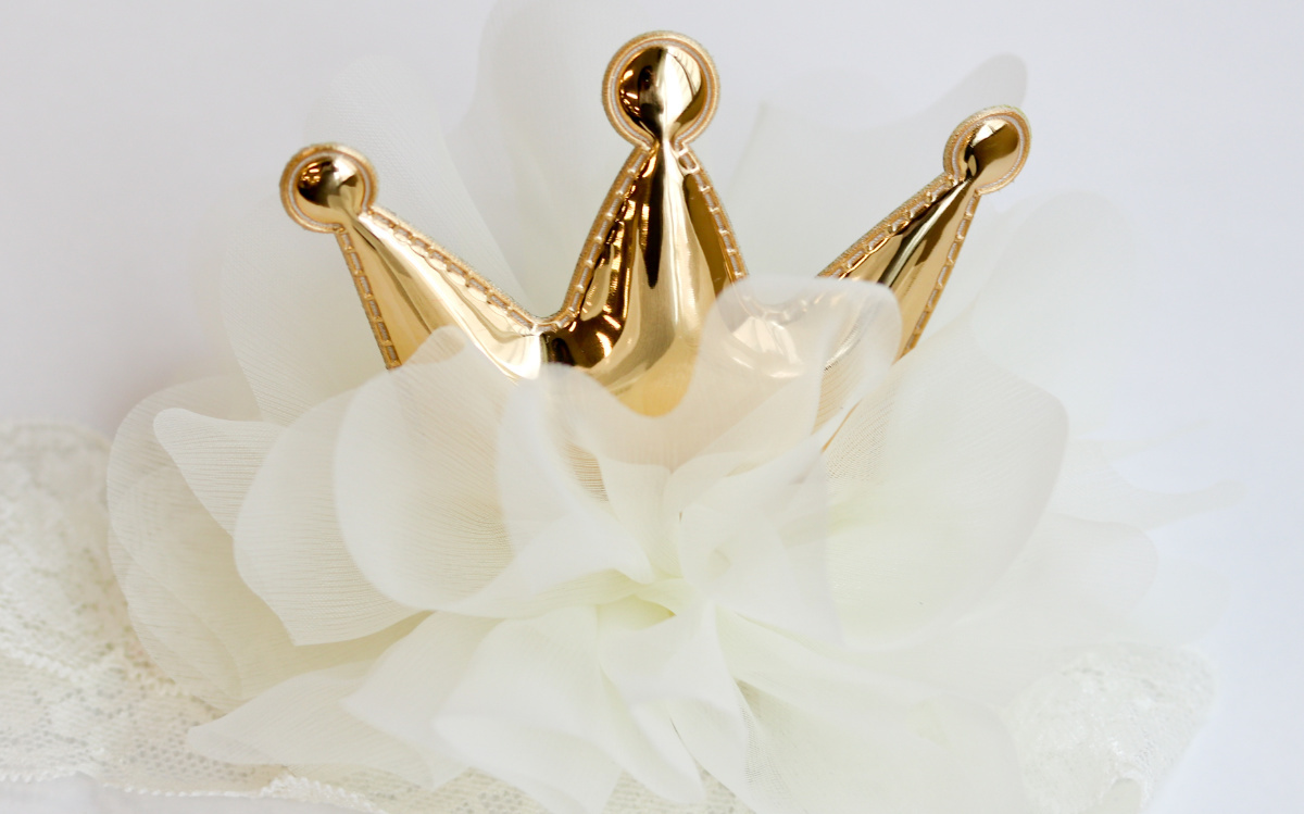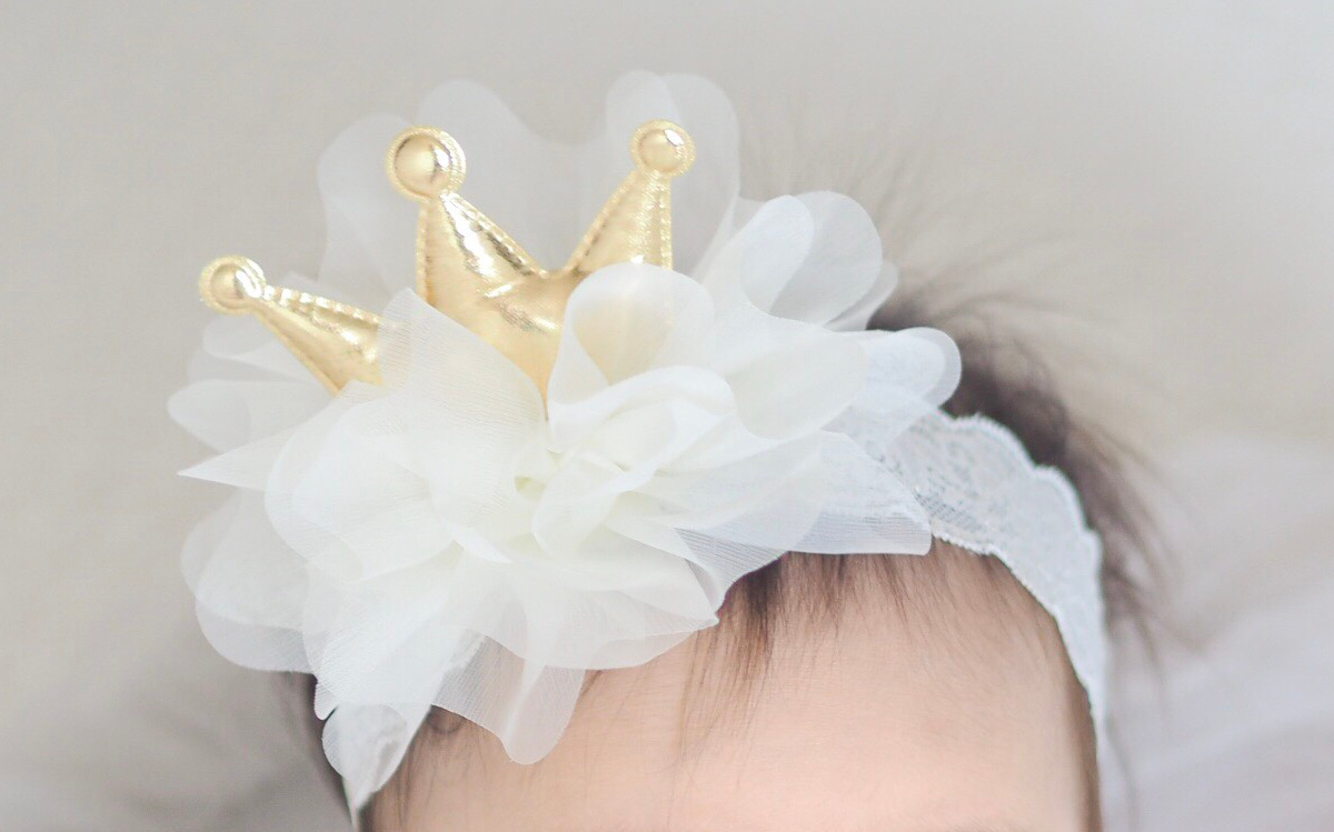 お出かけの際や記念日の写真撮影に真っ白でふわふわのチュール生地をふんだんに使用し、金色に輝くクラウンが存在感抜群のキュートなヘアバンドに仕上げました。赤ちゃんのお誕生日や記念撮影などの特別な日の装いを華やかに彩ります。