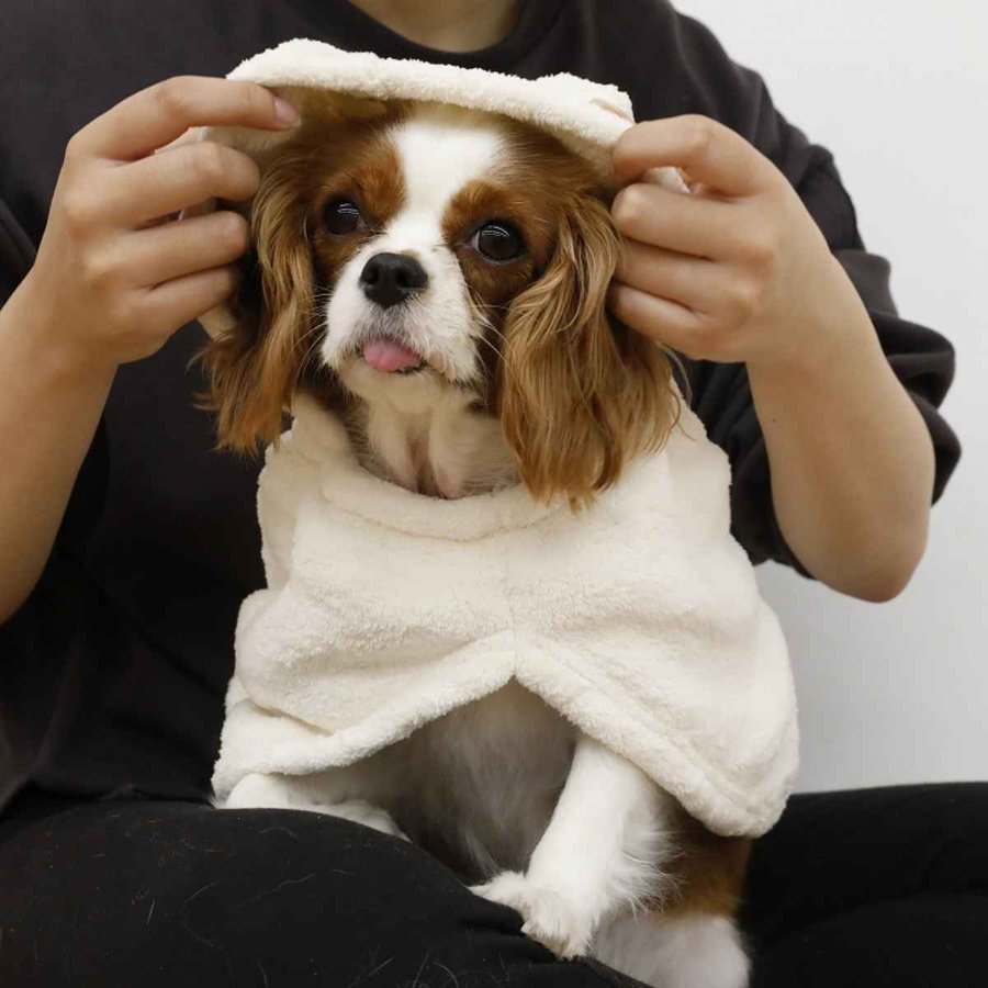かぶせて簡単タオルドライ、室内防寒ウェアとしても超小型犬から小型犬、猫に対したサイズです。シャンプー後や、雨の日のお散歩後に被せるだけ。水分を素早く吸収してくれるので、ドライヤー嫌いの子や、体力の低下したシニアペット、寒さが苦手な種類にもおすすめです。マイクロファイバーの隙間には空気が含まれており、保温性が高いので寒い日には、室内防寒ウェアとしても使用できます。